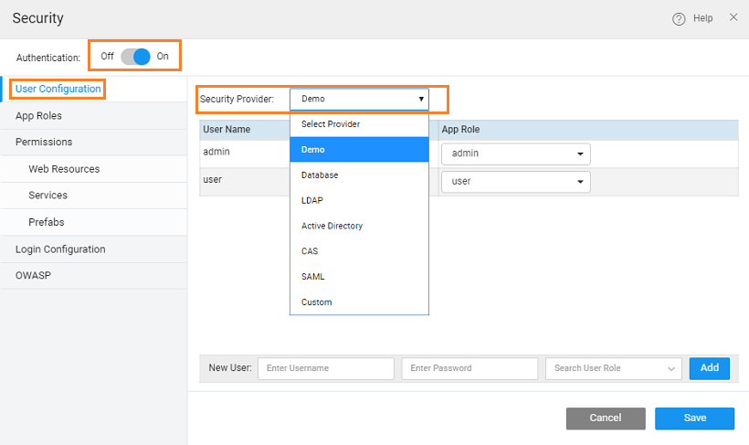 Once Authentication is switched on the User Configuration information can be obtained from Service Providers like Database, LDAP, AD or any custom provider.
