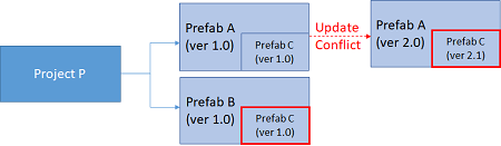 • Project P is using Prefab A which internally uses Prefab C (ver 1.0).