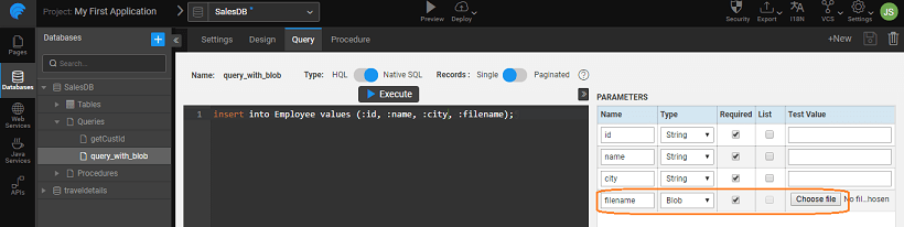 • Each Blob type column supports single file upload, i.e. not as a list. However, there can be multiple Blob params for a single query.