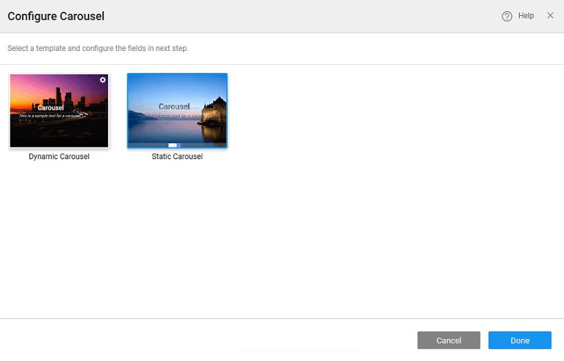 1. Dynamic where the Carousel content will take the form of an array or any repeated list like a dataset. The number of items displayed within the carousel will depend upon the number of rows in the bound variable. Carousel Template a subWidget of Carousel holds the slide content.