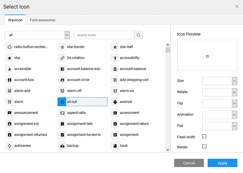 1. Choose a font-awesome or wavicon icon. NOTE: Wavicon icons are thin fonts that abide the iOS and Android mobile style guidelines.