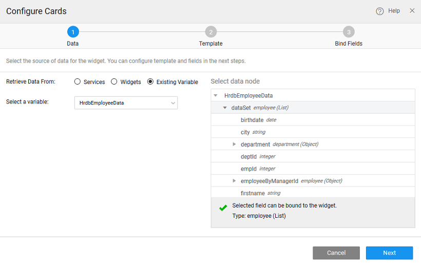 There can be different scenarios to deal with when configuring your Cards Widget with a data source. The data source can be in the form of a service - database, web or Java; or from an another widget on the page.