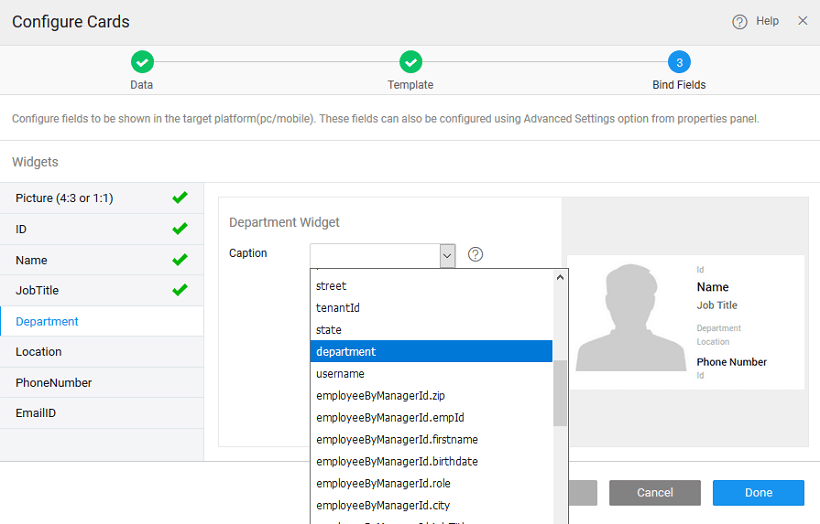 The template selected in the step-2 provides a set of widgets that should be bound to the corresponding field from the data source configured in the step-1. Select the widget and bind to the corresponding properties by selecting the field from the drop-down list.