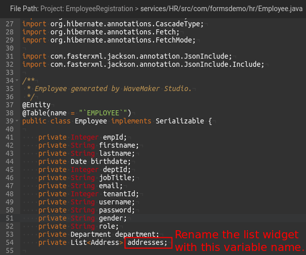• Step-10: Now search for the ${ParentEntityName}.java file under FileExplorer and check the Child entity reference name (variable name) and update the List widget name which dropped inside the Parent LiveForm with the Child reference variableName.