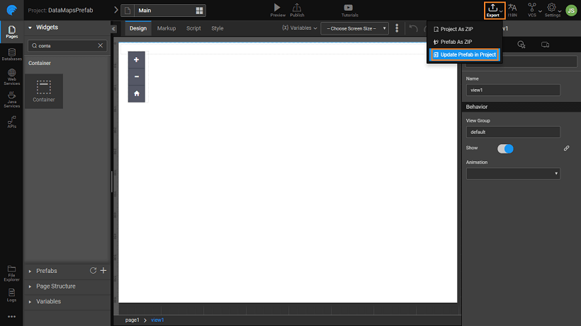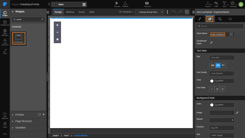 Drag and drop a Container Widget onto the canvas, and provide a Name: mapContainer