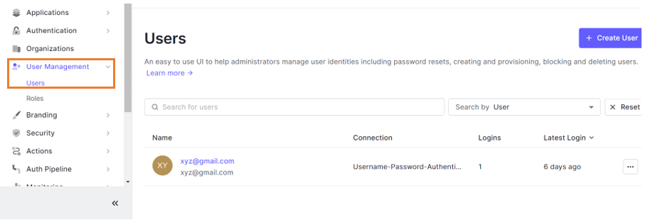 1. Click Create User. Enter email address and password and save the details to create a new user.