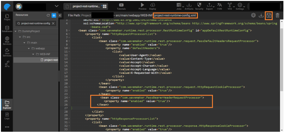 - Go to the project-rest-runtime-config.xml and add PassBearerHeaderRequestProcessor in the httpRequestProcessorList as a bean. Add the below-provided bean class and click save.