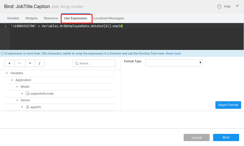 - From the canvas select JobTitle label widget, using the bind icon next to its Caption property, from the Use Expression dialog bind it as specified below.