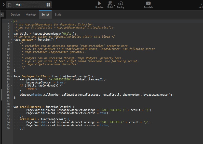 Now, plugin's API can be used. Since we need to make a call when the user taps on the list, set the on Tap event of the list to JavaScript and define the following JavaScript function to invoke the plugin API. Before invoking the Cordova API, a check has to be done whether Cordova is there. This will prevent errors in preview in browser.