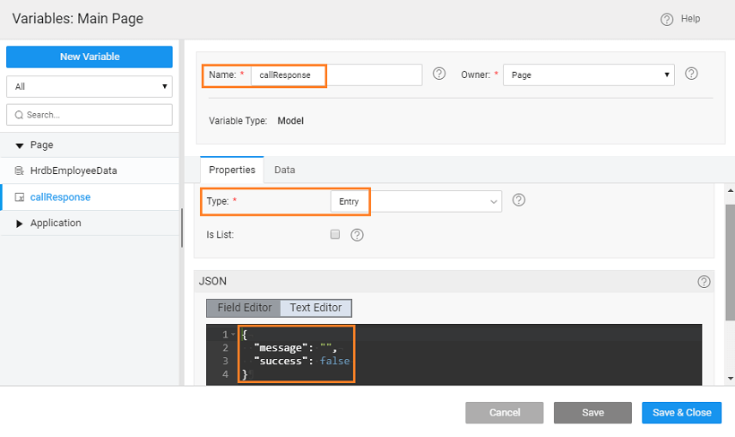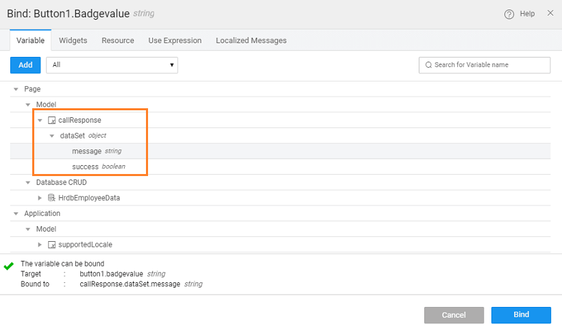 variable can be used in bindings. In the below image we are showing how a Button widget's Badge property can be used to display the call response message.