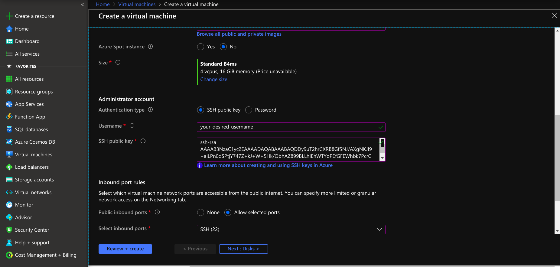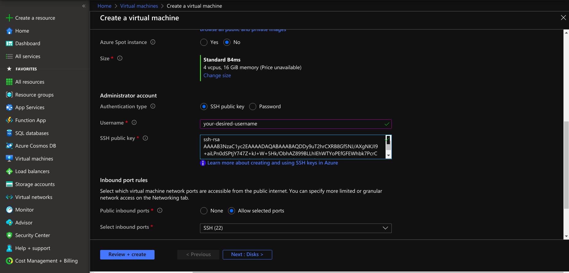 • Select the authentication type password or ssh public key for launching a virtual machine.