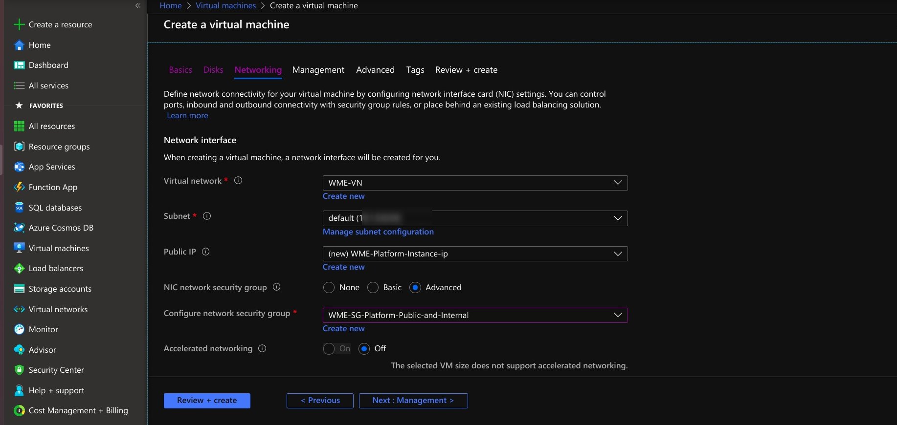 • At the networking section provide created virtual network details at the virtual network and at the NIC network security group select advanced options provide network security group of the platform.