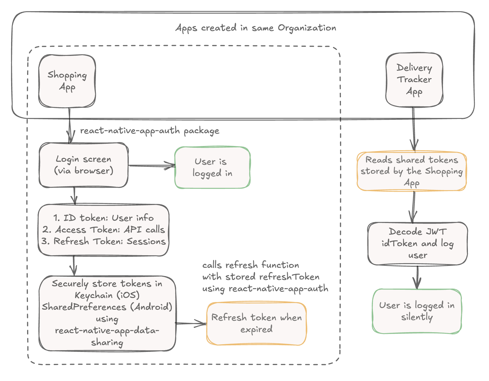 Subsequent applications can authenticate users automatically by reading the shared tokens stored by App 1. This process checks for valid tokens, refreshes them if needed, and logs the user in seamlessly without requiring manual authentication.